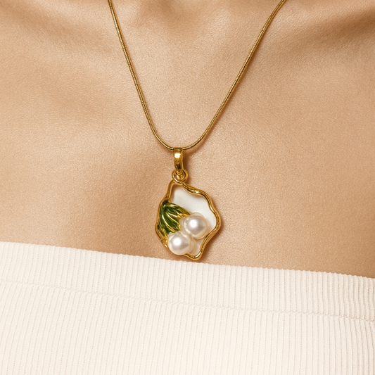 Elegant Pearl & Enamel Leaf Pendant Necklace